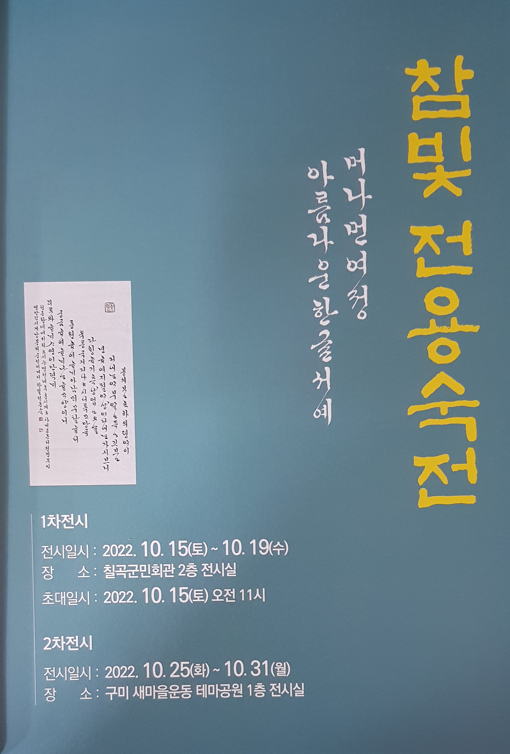 참빛 전용숙 (사)한국서예협회 칠곡지부장님의 머나면 여정 아름다운 한글서예 전시가 열립니다.