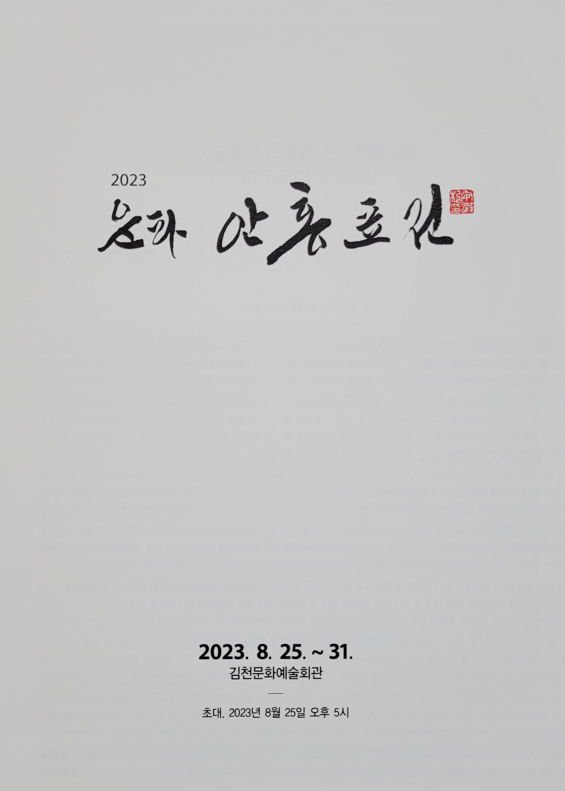 2023 운파 안홍표展 - 전시 : 2023. 8. 25.(금) ~8. 31.(목) - 초대 : 2023. 8. 25.(금) 오후 5시 - 장소 : 김천문화예술회관 (경북 김천시 운동장길 3 )