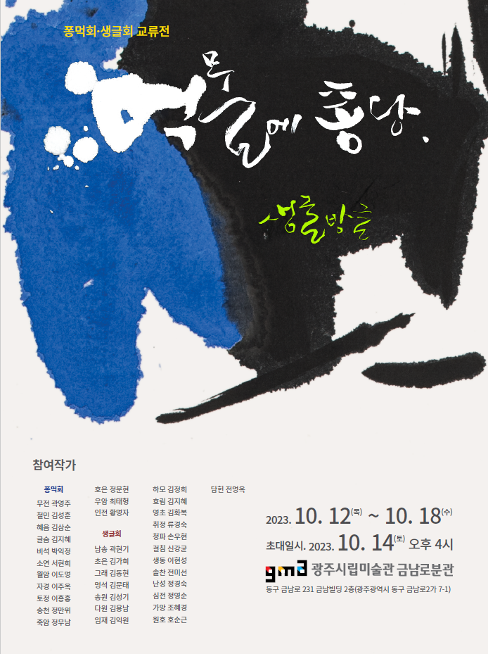 풍먹회ㆍ생글회 교류전 -일시 : 2023. 10. 12.(목) ~ 10. 18.(수) -초대 : 2023. 10. 14.(토) 오후 4시 -장소 : 광주시립미술관 금남로분관 (광주 동구 금남로 231, 금남빌당 2층)