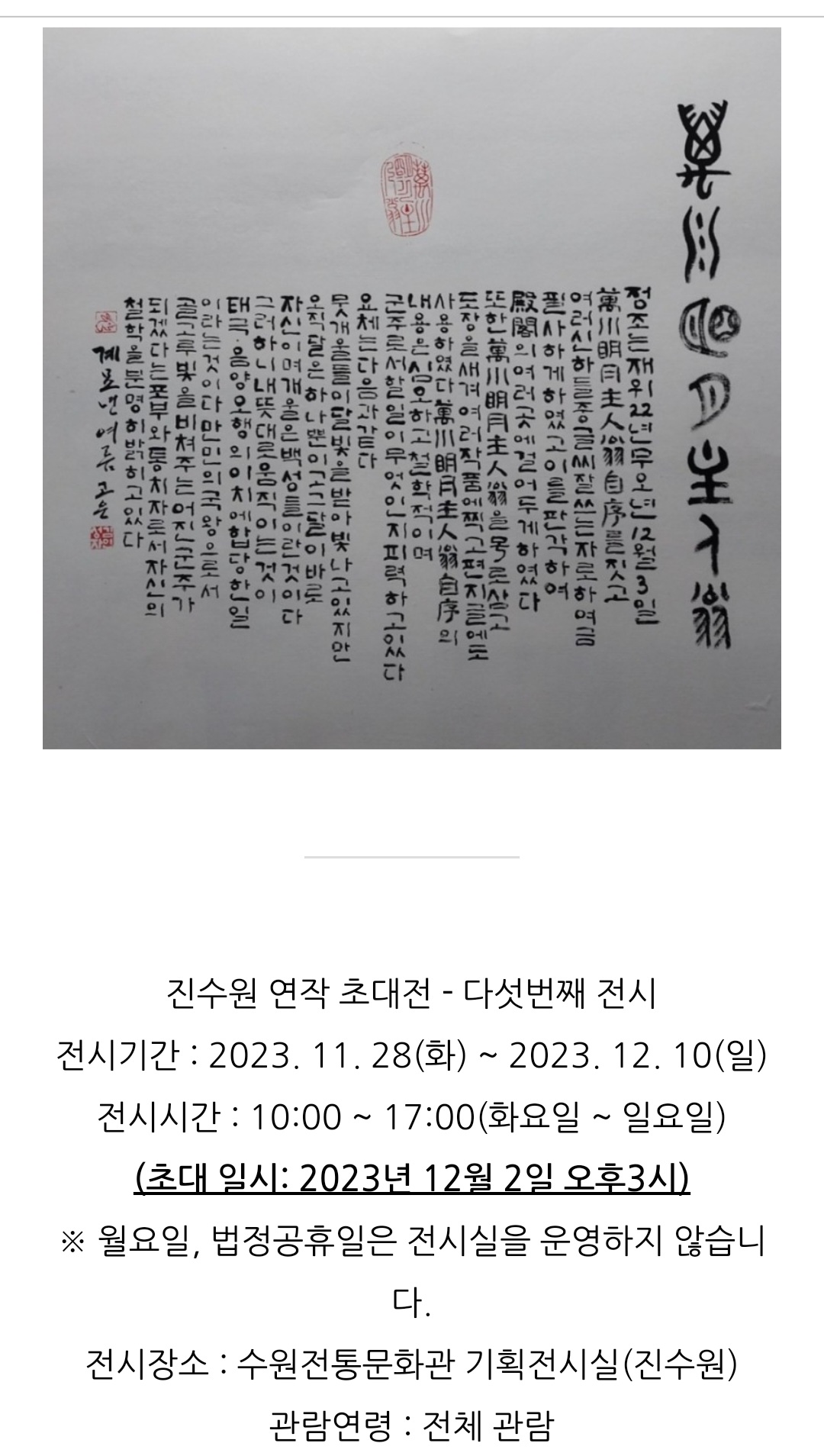 고은 김성자展 진수원 연작 초대전-다섯번째 전시 -전시 : 2023. 11. 28 (화) ~ 12. 10 (일) -초대 : 2023. 12. 2 (토) 오후 3시 -장소 : 수원전통문화관 기획전시실 (진수원) (경기 수원시 팔달구 정조로 893)