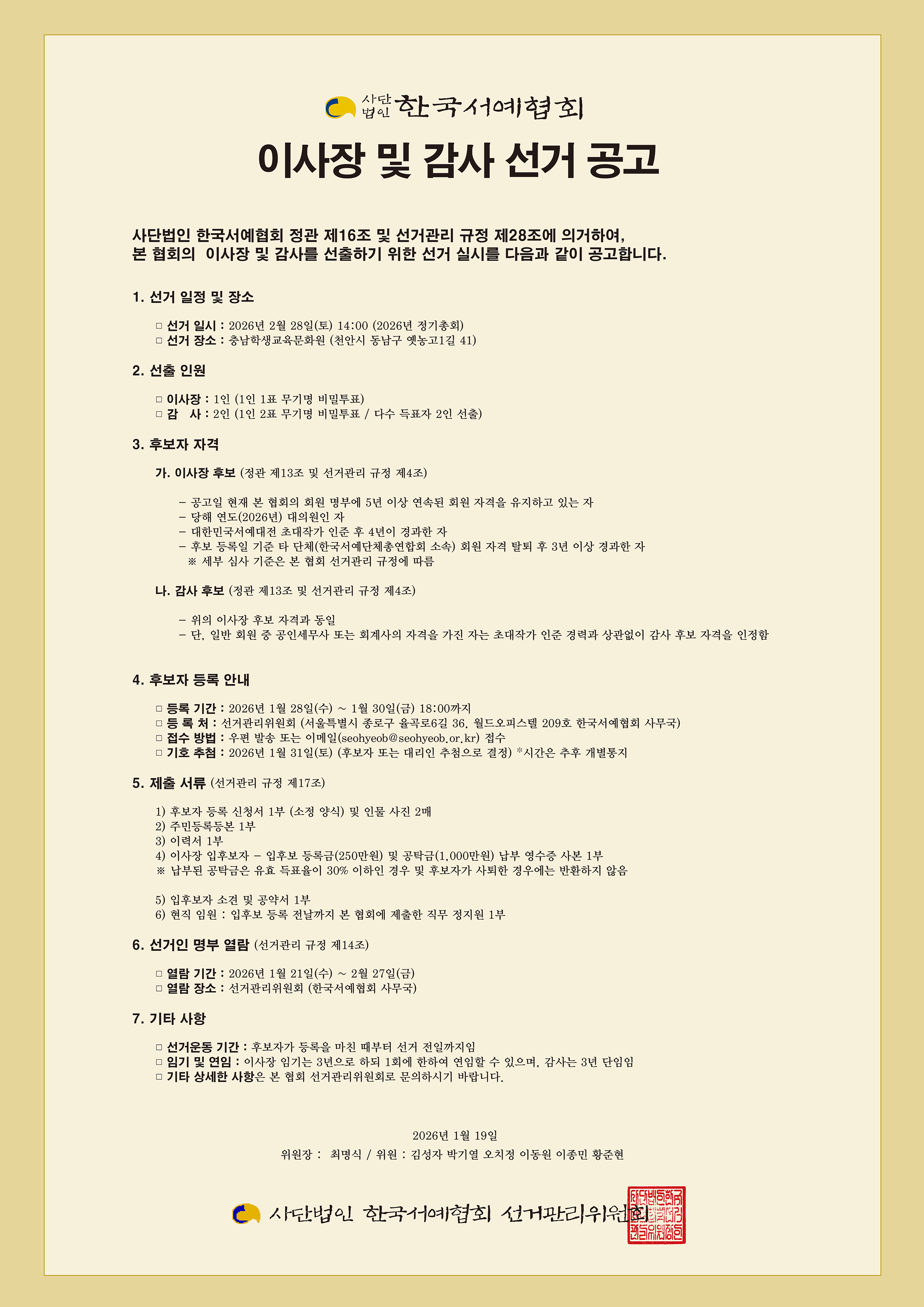2026 한국서예협회 이사장 및 감사 선거공고