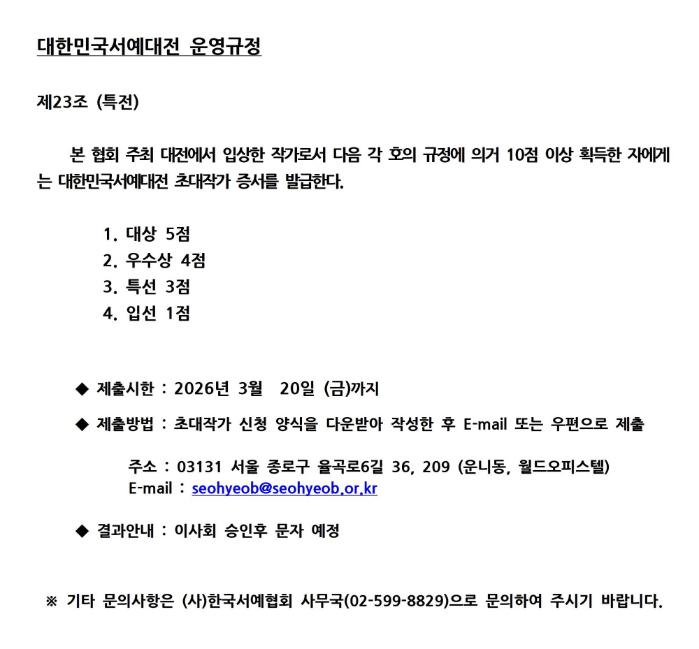 2026 대한민국서예대전 초대작가 신청 안내
