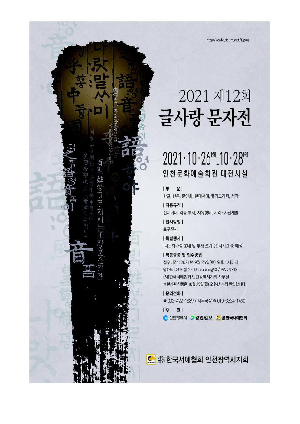 (사)한국서예협회 인천광역시지회(지회장 한규식)가 제12회 글사랑문자전을 갖습니다.